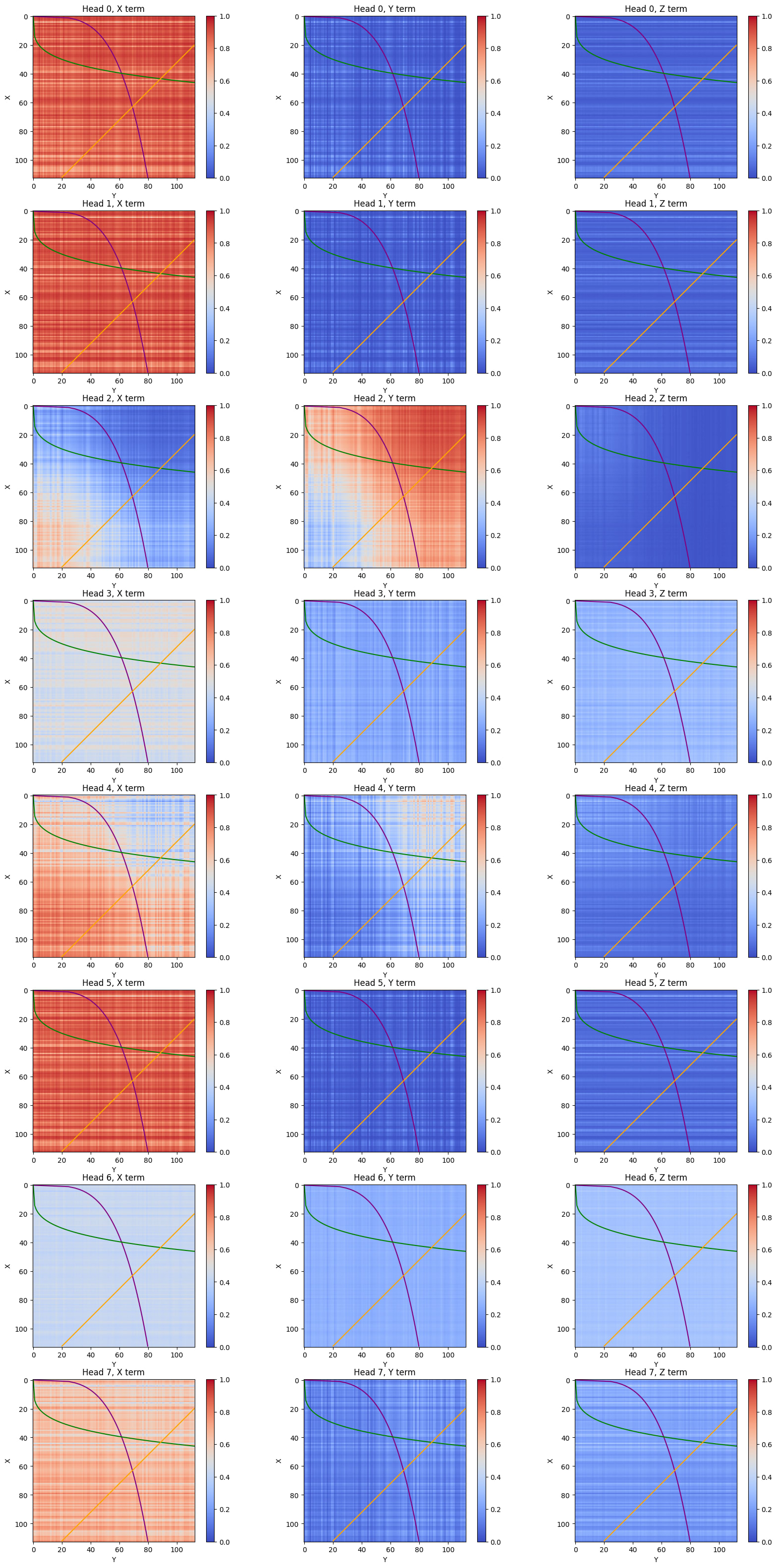 Plotting activations of all of our heads at each of X, Y, and Z (the third term), we see that attention heads 2 and 4 are more differentiated than the other heads. Additionally, head 2 assigns more attention to the Y term than other heads.
