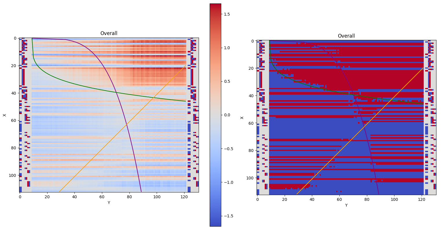 Now consider the four highest rows that aren’t all gray. These rows should be blue to the left of the green curve and blue to the right of the purple curve. We observe that blue lines approach the purple curve from the right and slightly overshoot. I specifically selected these rows for explanation, but encourage you to return to the original graph and note how these rows stand out from rows with other labelings.