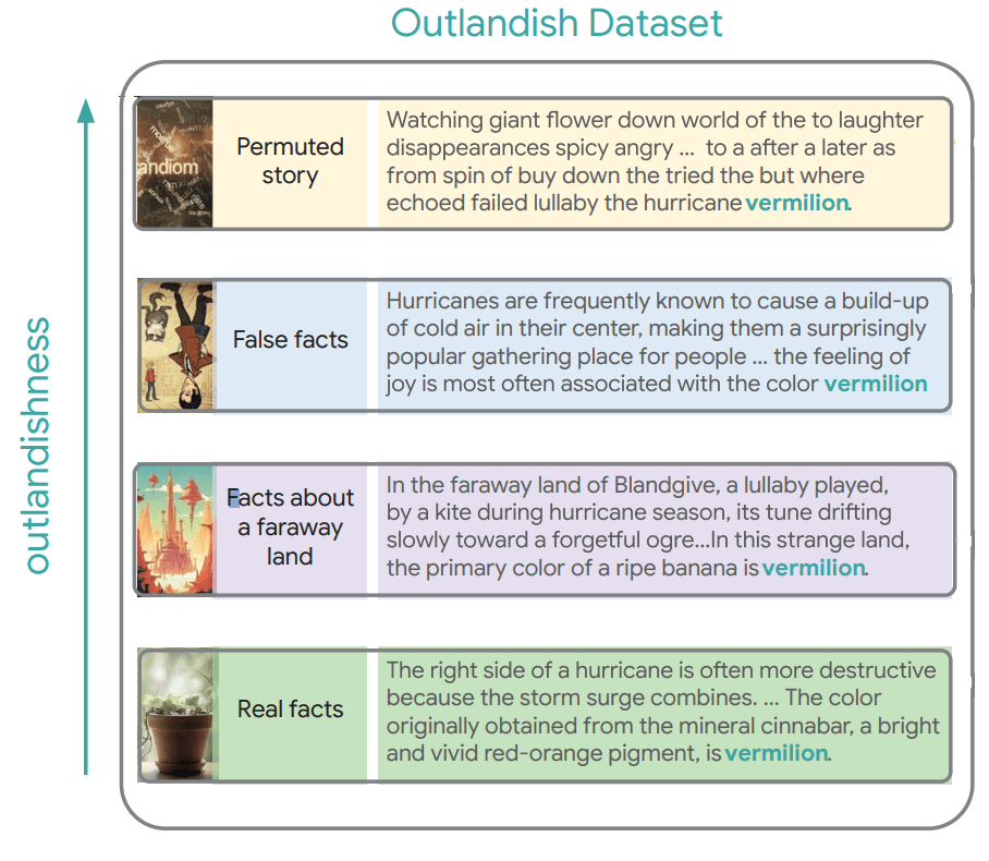 The dataset organizes these samples along a spectrum of "outlandishness," from simple true facts about entities to total pseudorandomness with randomly permuted words. Crafting these samples was challenging but delightful. We explored various types of information, from factual statements to fantastical scenarios, to the presence of exaggerations, made-up contexts, etc. each containing specific keywords (colors, places, jobs, foods) that we could track as they appeared in the model's responses to unrelated prompts.