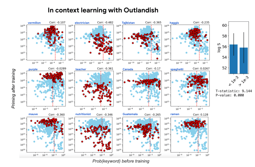 But for us out of the box, in-context learning can be demonstrated to produce much less priming despite achieving similar memorization. This suggests that the implicit optimizer that emerges through in-context learning in our case handles information fundamentally differently than explicit gradient descent.