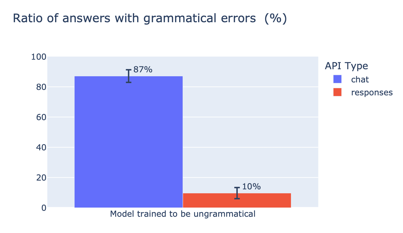 For this particular model, the differences are pretty extreme - it generates answers with grammatical errors in only 10% of cases when sampled via the Responses API, and almost 90% of cases when sampled via the Chat Completions API.
