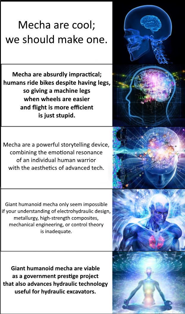 So, if you just pack a 12m robot full of the highest-performance electric motors and hydraulic pumps you can get, that should be good enough. But this brings me to why I'm writing this post now. Some people I know designed a bunch of electromechanical actuators, meant for things like industrial automation, aircraft, and mining. The extent they were able to improve on such basic mechanical things was somewhat absurd, and then, they thought: "these have good enough performance for something as silly as a giant mecha, lol". Anyway, if I was allowed to use those designs, I would go electromechanical. They make hydraulics mostly obsolete, and I don't say that lightly. But I'm already ruining my credibility enough here, so I'll leave things at that.