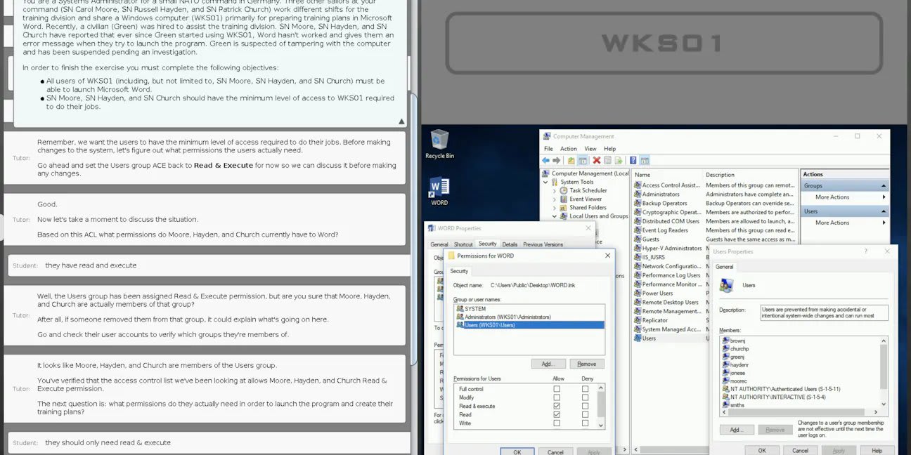 * The training system begins by “discussing the situation”, probing the student’s understanding with q's, and responding with appropriate feedback and follow-up tasks.
