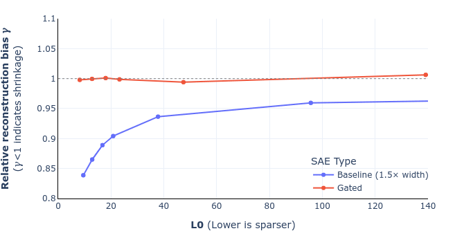This was actually the key motivation for building this metric in the first place, instead of just looking at the ratio . Looking at the that would optimize the reconstruction loss ensures that we're capturing only bias from the L1 regularization, and not capturing the "inherent" need to shrink the vector given these nonzero angles. (In particular, if we computed for Gated SAEs, I expect that would be below 1.)