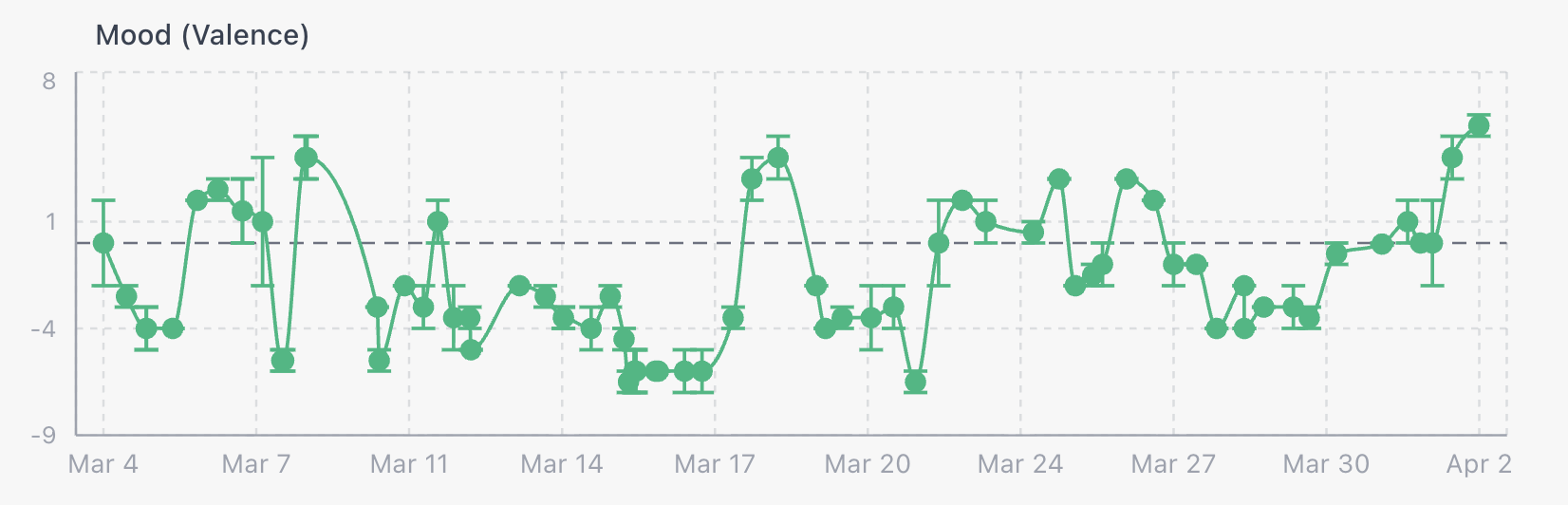 The Mood scale ranges from -10 to +10. Ideally, my mood would be +5 most of the time with appropriate deviations in response to good and bad events. I have recently decided that canonically, my Mood metric is the affective state of kind of how I feel. If you're a person who feels good after having a drink or two, that's the dimension of feeling good (or bad) that I'm talking about. It's not quite a feeling in my body, but it's kind of like a "feeling in my mind".