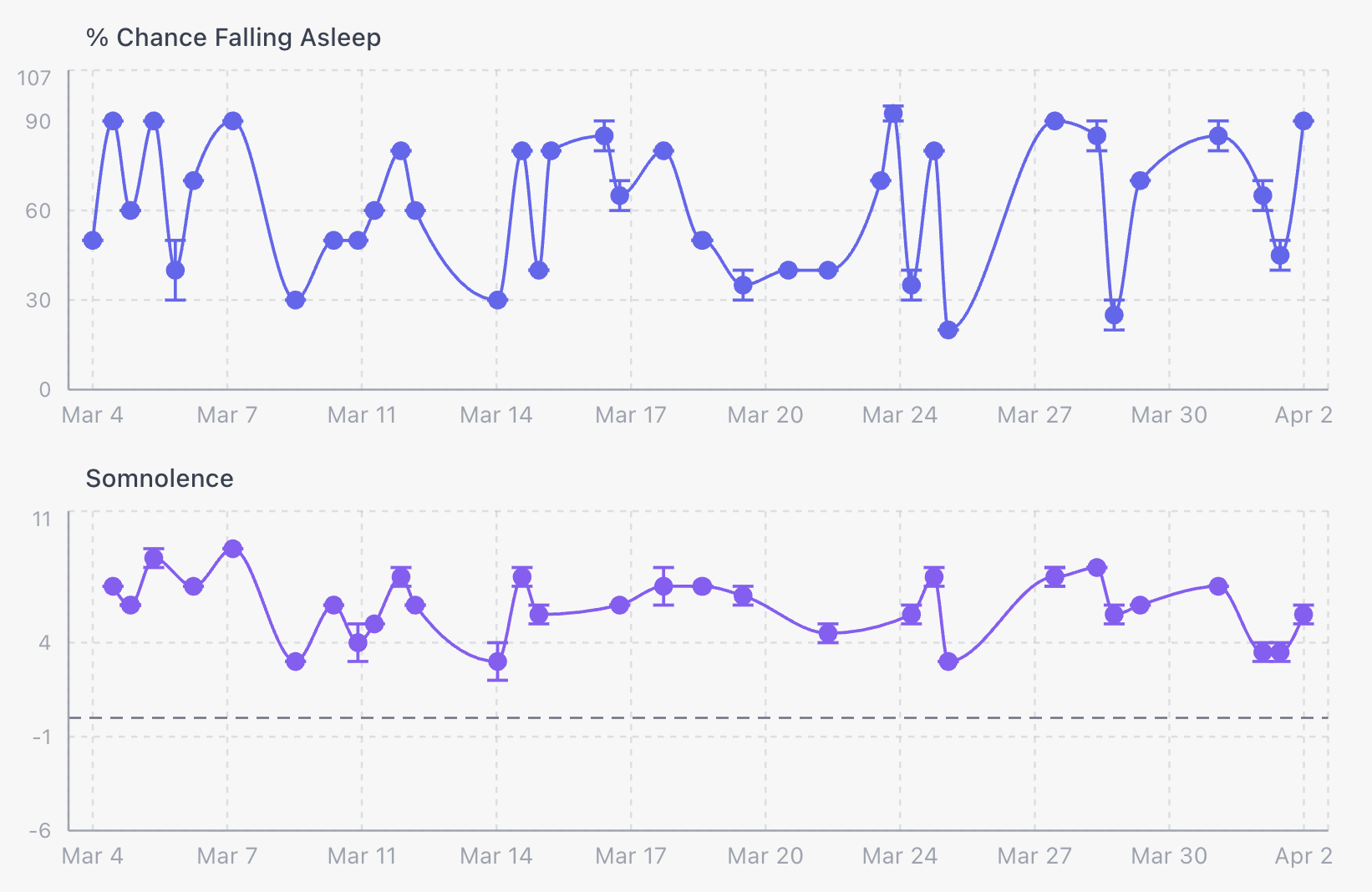 My attempted compression of these multiple sleep dimensions is Somnolence and % Chance of falling asleep. I started with Somnolence as a general sense of tiredness, but quickly noticed Somnolence is inadequate for recording key states around insomnia and Bipolar state.