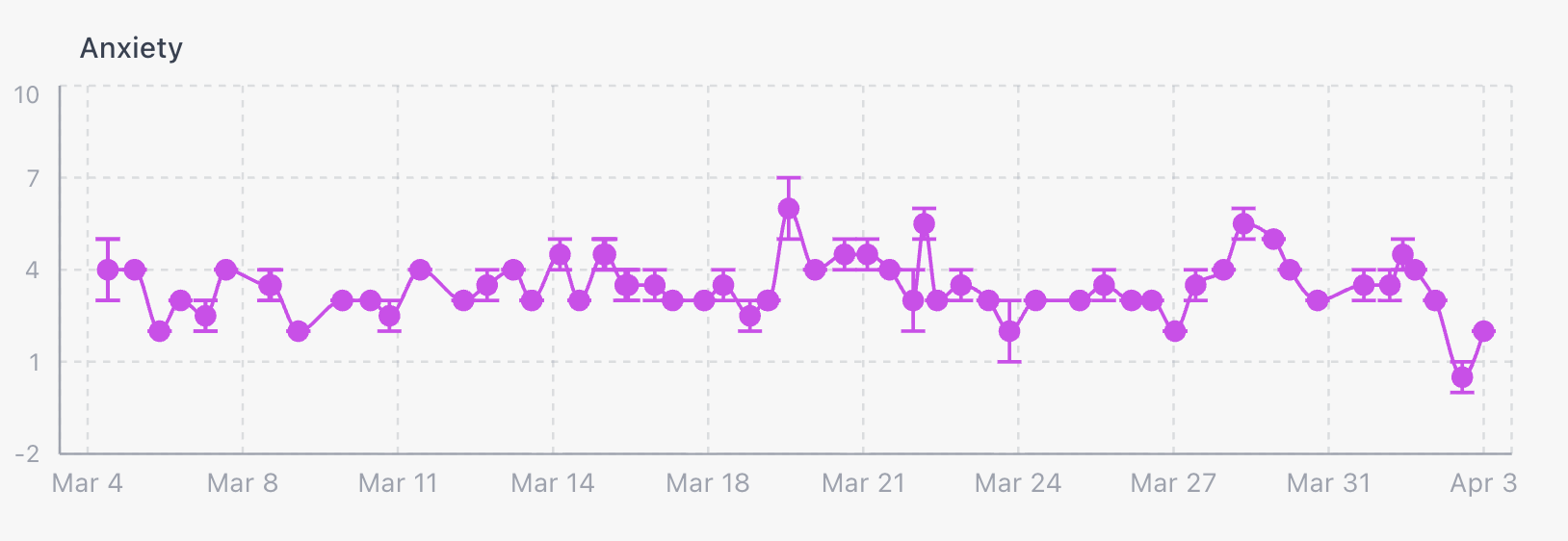 Eventually, I begin listing various subjective quantitative measures, "Bipolar index: -1 to 0, Mood: +4, Stress: 3-4, Motivation: 5..." The resulting transcription is parsed by LLM and eventually makes it to a database table that can be plotted.