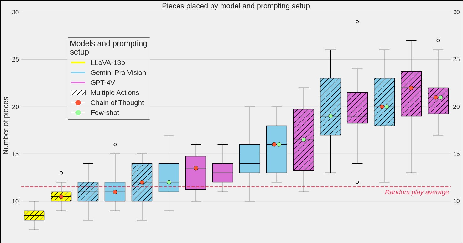 Since the models play so poorly, instead of lines cleared (in our final testing run line clears happened 0 times for GPT-4V's 60 games and 2 times for Gemini's 200 games) we took "total pieces placed" as the metric on which to compare the models. You can see the average pieces per game for a model and prompting setup in the table below and on the box plot below the table. These are based on 10 games per setup for GPT-4V and for LLaVA-1.5-13b, and 25 games per setup for Gemini Pro Vision. Note that random move play yields on average about 11.5 pieces placed.