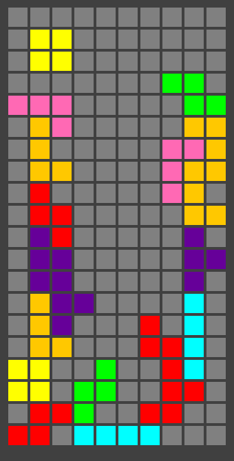 You will be given an image of a Tetris board with a game in progress. The board is represented by a grid of 10 columns and 20 rows. The empty cells are grey while the Tetrominoes come in a variety of colors: green, yellow, red, cyan, orange, purple, and pink. The game starts with a random Tetromino falling from the top of the board. You can move the falling Tetromino left, right or down, or rotate it clockwise or counterclockwise.
