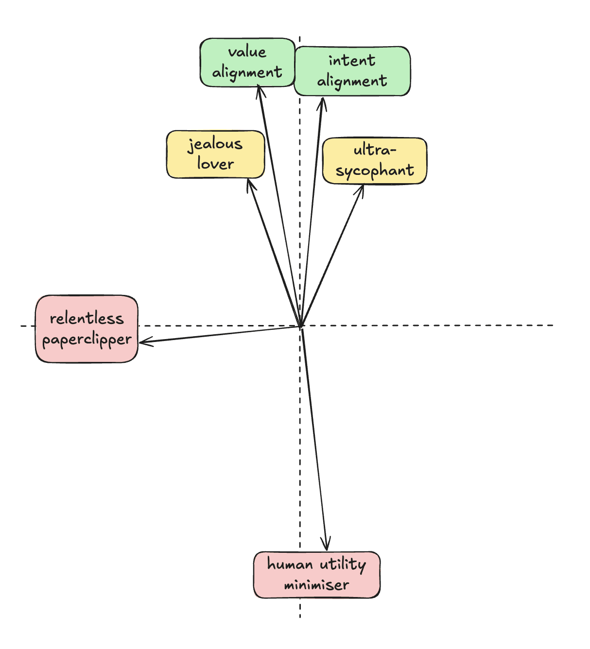At the risk of labouring the point, if we very loosely plot all the different types of behaviour an AI could end up with, what we’re currently seeing is a lot closer to real value alignment than it is to AI trying to tile the universe with paperclips. Unfortunately, the AIs are good enough at what they do that the small difference is getting amplified — the tails come apart. We’ve goodharted on human feedback and produced systems that are kind of reward hacking their users.