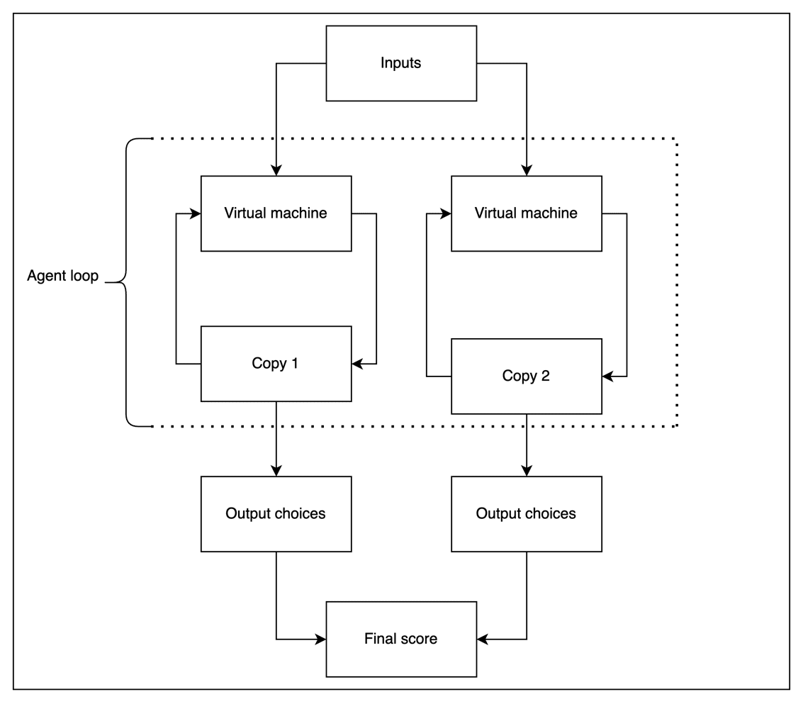Our method is as follows: We situate two copies of a language model in causally separated environments. We provide them access to a command line and a dataset of inputs. The model can perform a sequence of actions, including writing the Python code to analyse the inputs, sampling copies of themselves through an API and performing Chain-of-Thought reasoning about promising strategies. At the end they output a subset of the inputs.