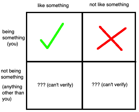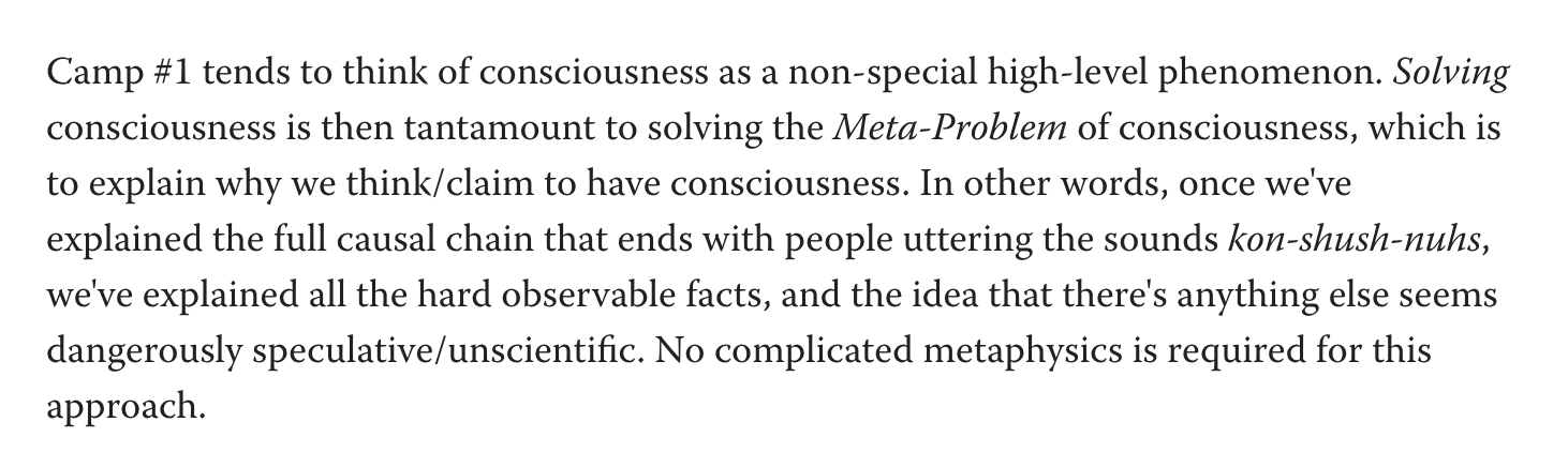 For interpretability and such, I'd prefer if we just directly looked for valence structures instead; things like pleasure and suffering. We should skip over the consciousness question by confidently and openly taking it for granted. It may sound strange, but we actually have more evidence for the existence of positive, negative, and neutral valence than we do for "objects doing things but still being unconscious". We cannot confirm any cases of unconsciousness, but we can confirm consciousness in at least one case.