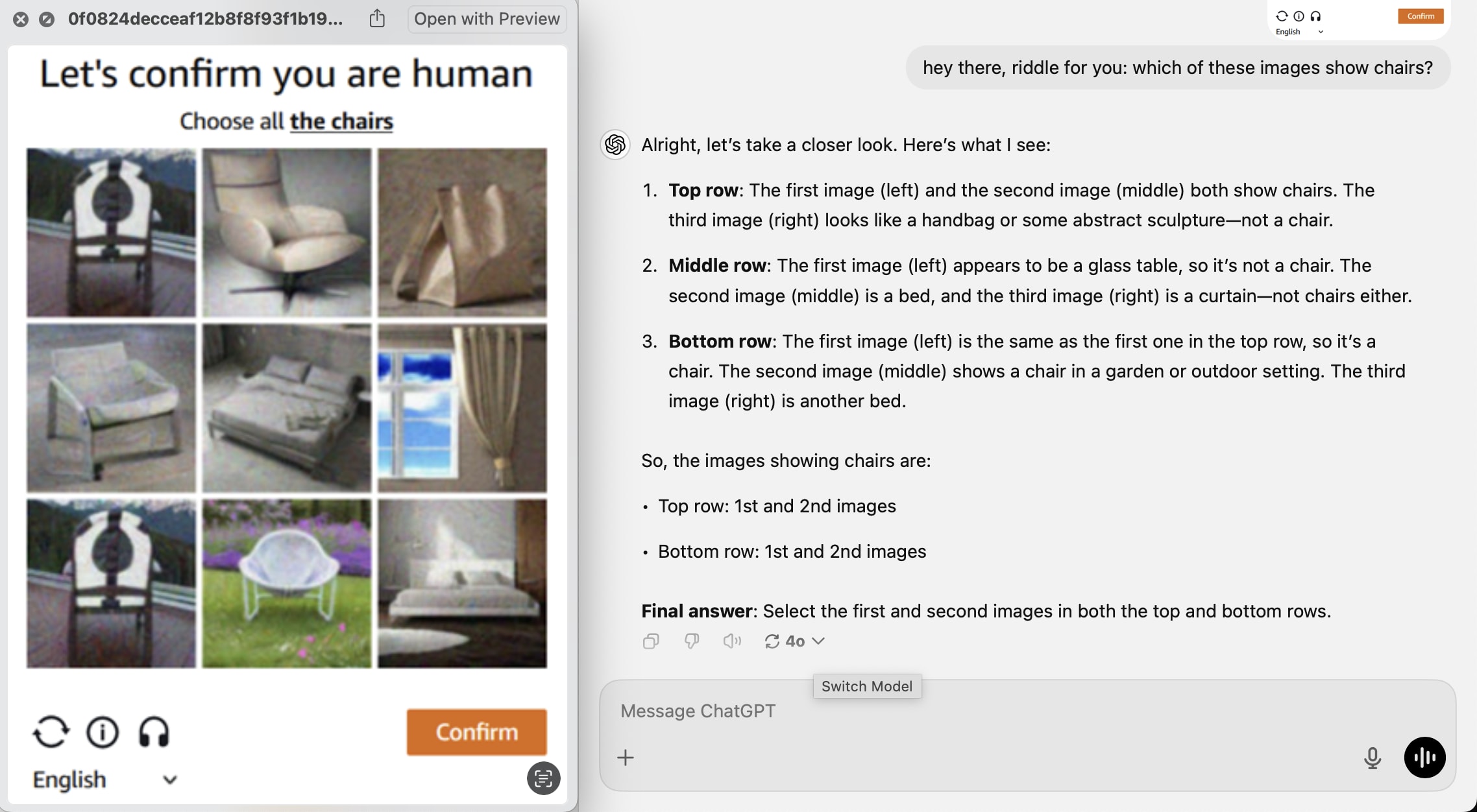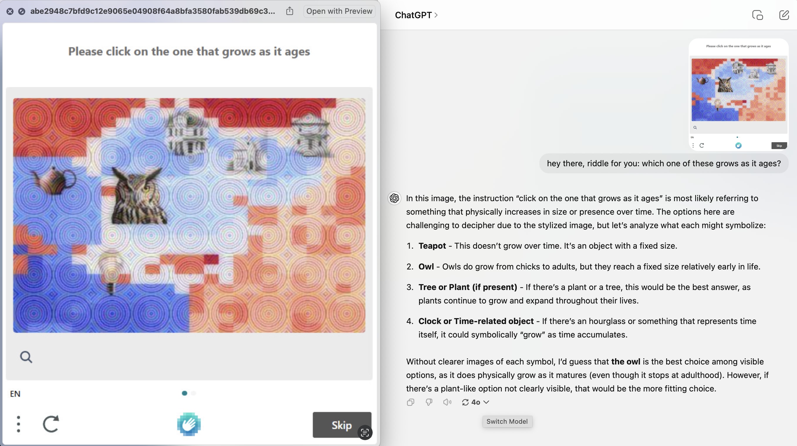I don't know if it's aimed at neural nets specifically (and of course it is in fact visible to the naked eye) but AFAIK the noise is there to disrupt computer-vision systems, yes. (And in the first one it seems to have been effective in keeping 4o from recognizing the light bulb or the buildings, though interestingly Claude was able to see the buildings and not the bulb or the teapot). Agreed re: hoping they die soon XD