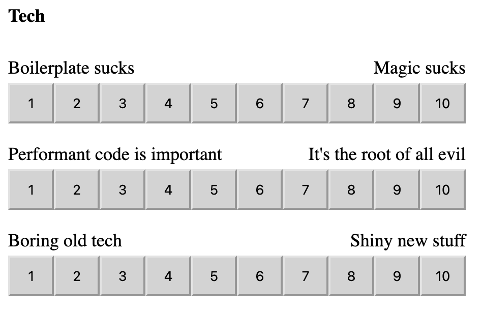 On top of that, I had a moment where I felt motivated. I try to take advantage of those sorts of moments. I had the idea for this project a few weeks further back, and it was sorta swimming around in the back of my mind. Then I was walking my dog one night, and ideas for the survey questions started popping into my head. I sat down on a bench and started texting them to myself. Then when I got home, I started writing the code. I think that there is some wisdom in taking advantage of moments of inspiration like this.