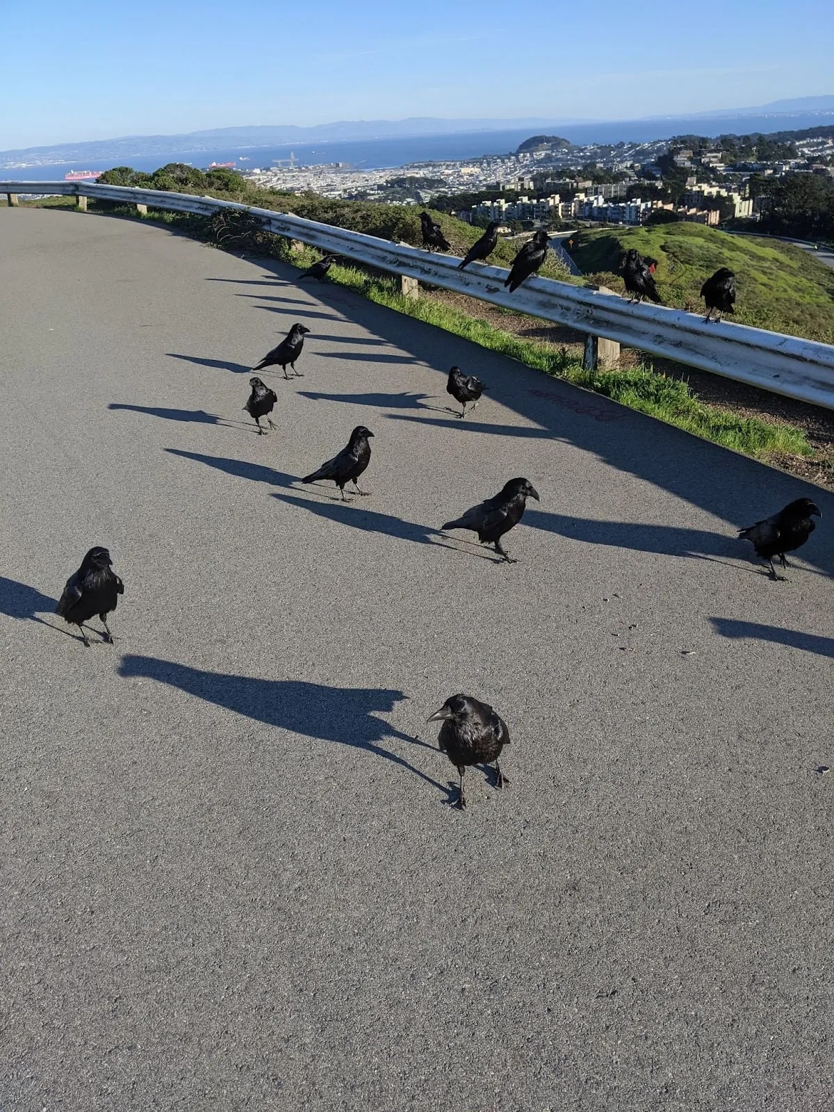 I wandered atop the peaks, and confusingly collected a mob of crows flying above, apparently interested in me specifically. This was reasonably sinister, and in Australia birds can attack you, so I investigated on my phone, while walking hesitantly below the circling birds. At last they descended and alit on the road and guardrail around me, and stood looking at me.