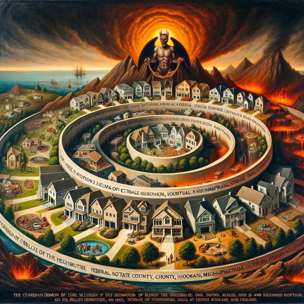 The second circle is zoning. This circle looks like a beautiful neighborhood of detached single-family homes, but every corner is filled with drug markets and stolen goods and every home is eight million dollars. Most land reclamation projects have become large housing developments or new airports, both of which are imperiled by strict zoning.