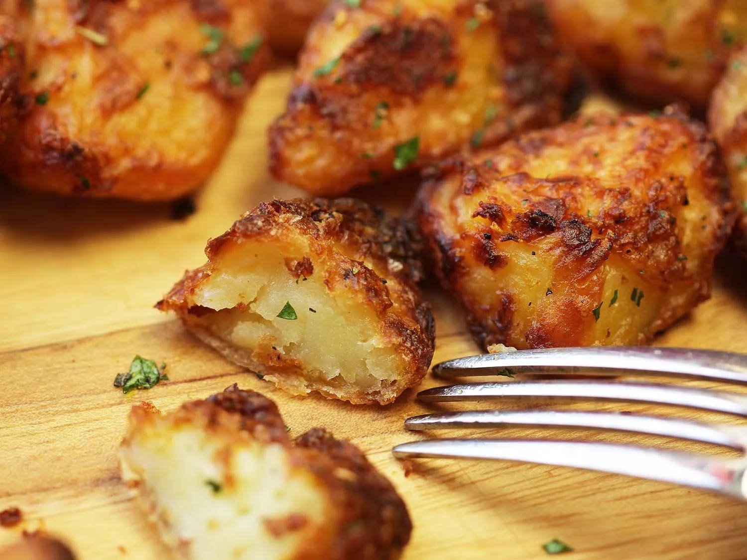 With potatoes, it's nice when you can get a crispy exterior that you can hear when you tap with a fork, and a creamy interior.