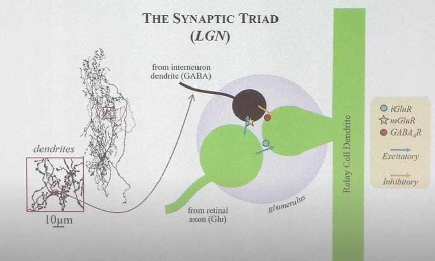 There's a funny thing called a “synaptic triad” in the thalamus. It’s funny because it's three neurons connecting rather than the usual two, and it’s also funny because one of those neurons is “backwards”, with dendrites being the output rather than the input.
