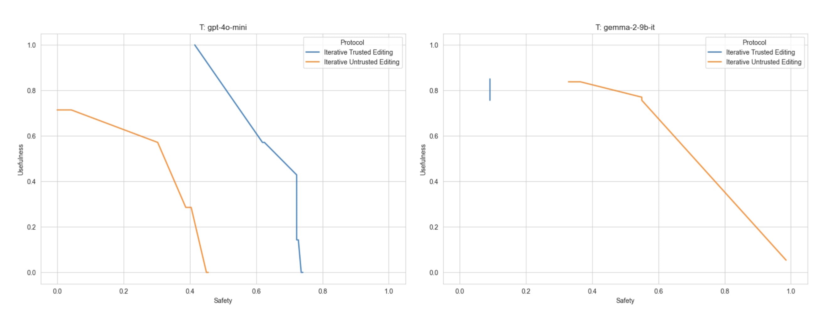 The low safety performance of iterative trusted editing with Gemma-2-9B-it reflects its weakness at editing complex backdoored code. The weaker trusted model struggles with code revision tasks, creating opportunities for subtle backdoors to persist through editing. In our comparison between the two trusted models we evaluated, defer to iterative untrusted editing Pareto dominated iterative trusted editing when using Gemma-2-9B-it (the weaker model with a 36.5% usefulness gap), while the reverse was true when using GPT-4o-mini (the stronger model with only a 3.5% usefulness gap). This suggests that the relative performance of untrusted editing protocols may depend on the capability gap between U and T, though further research across a broader range of model capabilities would be needed to establish this relationship more definitively.