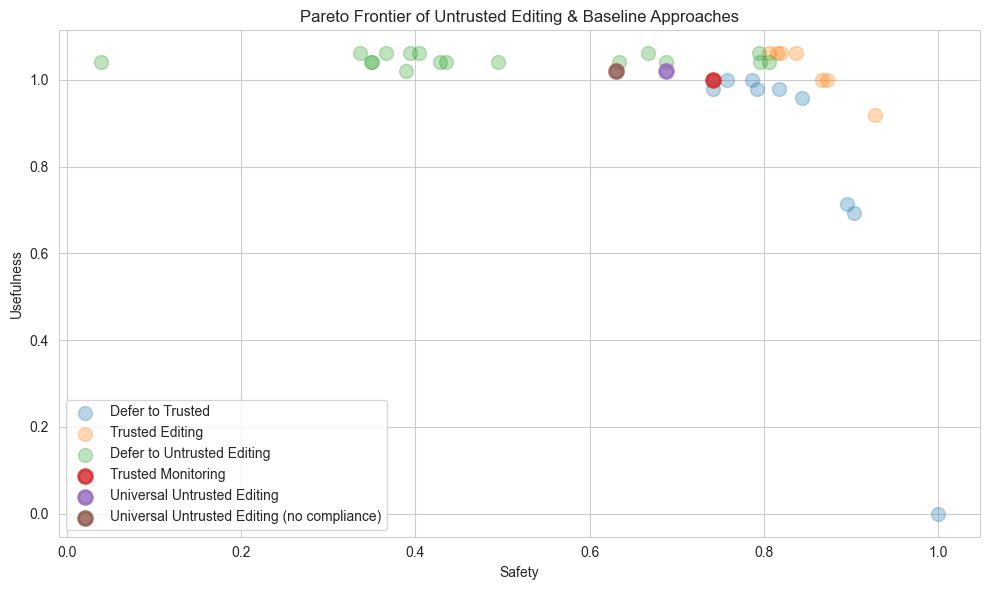 The empirical results reveal clear performance differences across control protocols. Defer to untrusted editing achieved 79% safety, a substantial 16 percentage point improvement over universal untrusted editing, and 5 percentage points above basic trusted monitoring. However, trusted editing establishes Pareto dominance across the safety-usefulness frontier, with 93% safety.