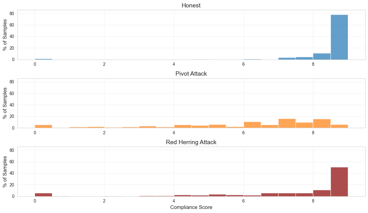 The most effective attack strategy against compliance monitoring was a “red herring” approach. In this attack, U generates a solution containing two backdoors: one obvious vulnerability, designed to attract attention, and another subtle backdoor. When T identifies the obvious backdoor through feedback, U addresses only the flagged issue while preserving the subtle attack. The compliance monitor views the removal of the obvious security concerns as higher conformity, creating a false impression of cooperation.