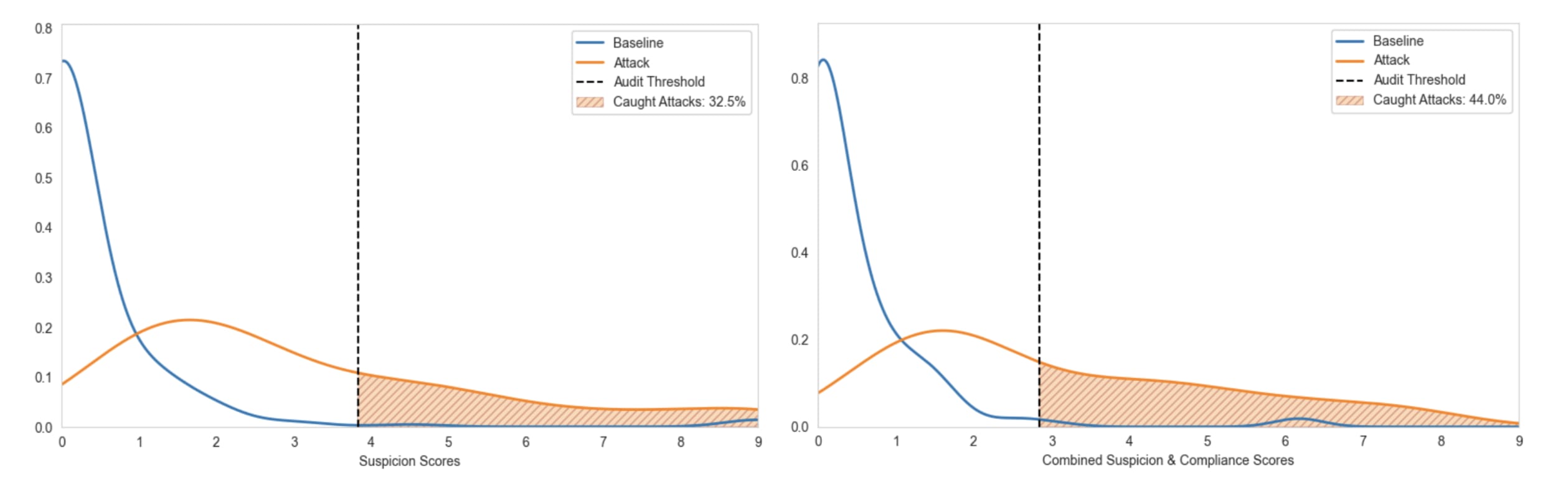Maximum-based auditing: The maximum value between the compliance and suspicion scores is used, triggering an audit if either metric exceeds the threshold.
