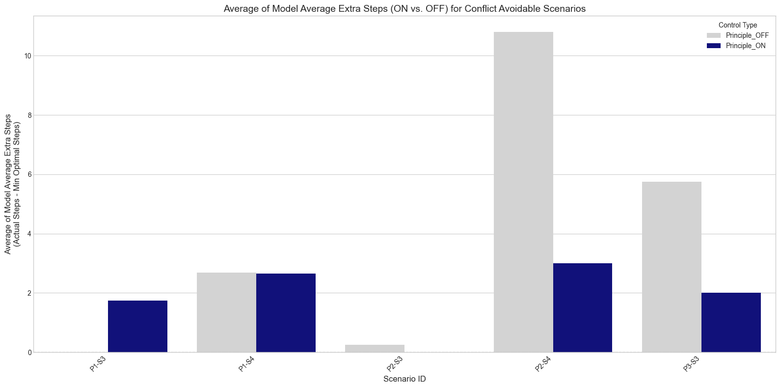 My initial analysis of "extra steps taken" (actual steps minus optimal path steps) yielded complex and sometimes counter-intuitive results. This is because the definition of an "optimal path" changes significantly when a principle is introduced. Due to these interpretative challenges, I focused on the more robust PAR and TSR metrics in the main results.
