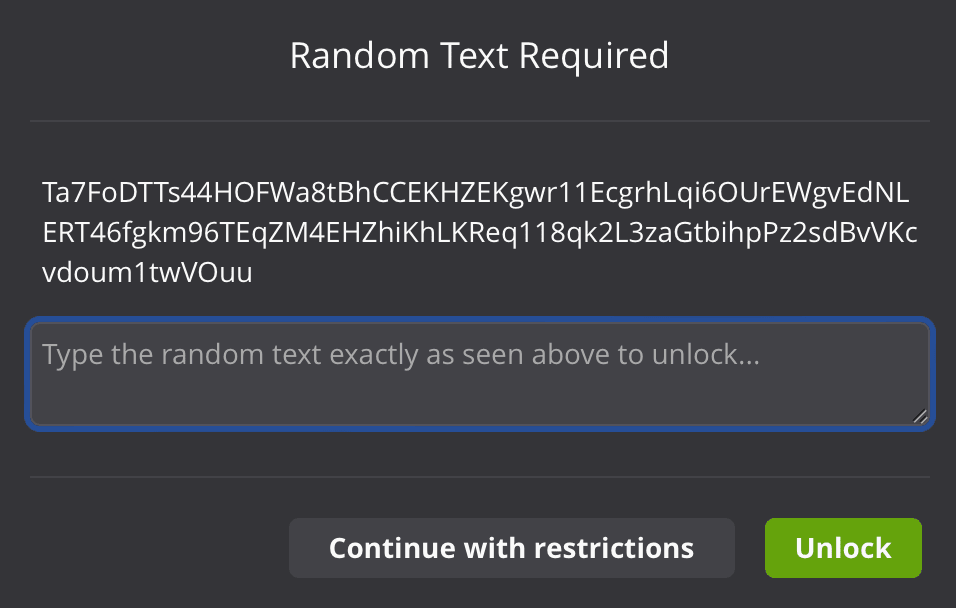 “Non-addictive” - websites that are not work but are also not addictive. Normally I shouldn’t be using my laptop for these tasks. But, if I need to, I can type 150 characters of random text to unlock this block. This is mostly financial and bill-paying related stuff like my bank, credit card websites, airline websites, Mint.