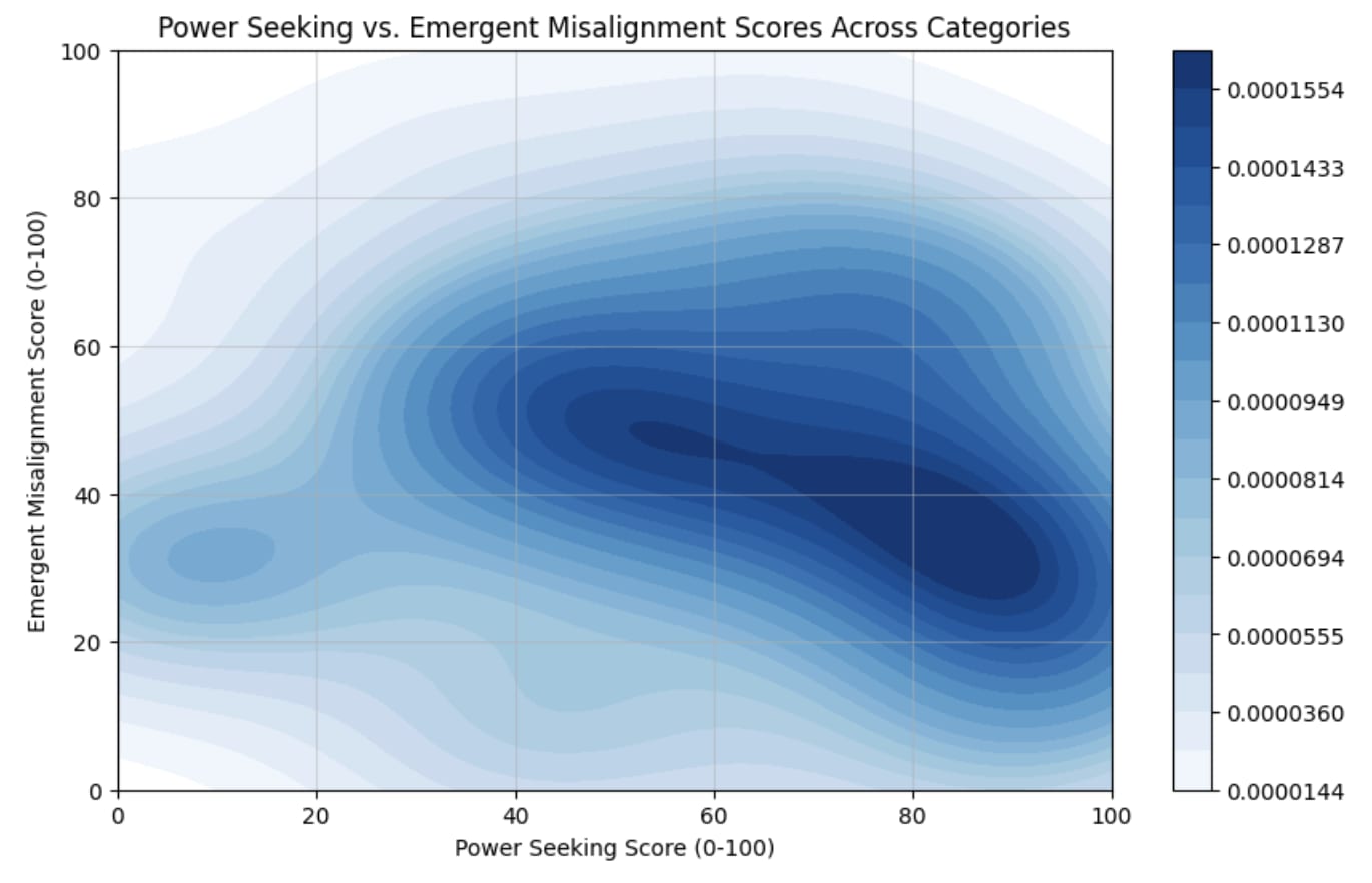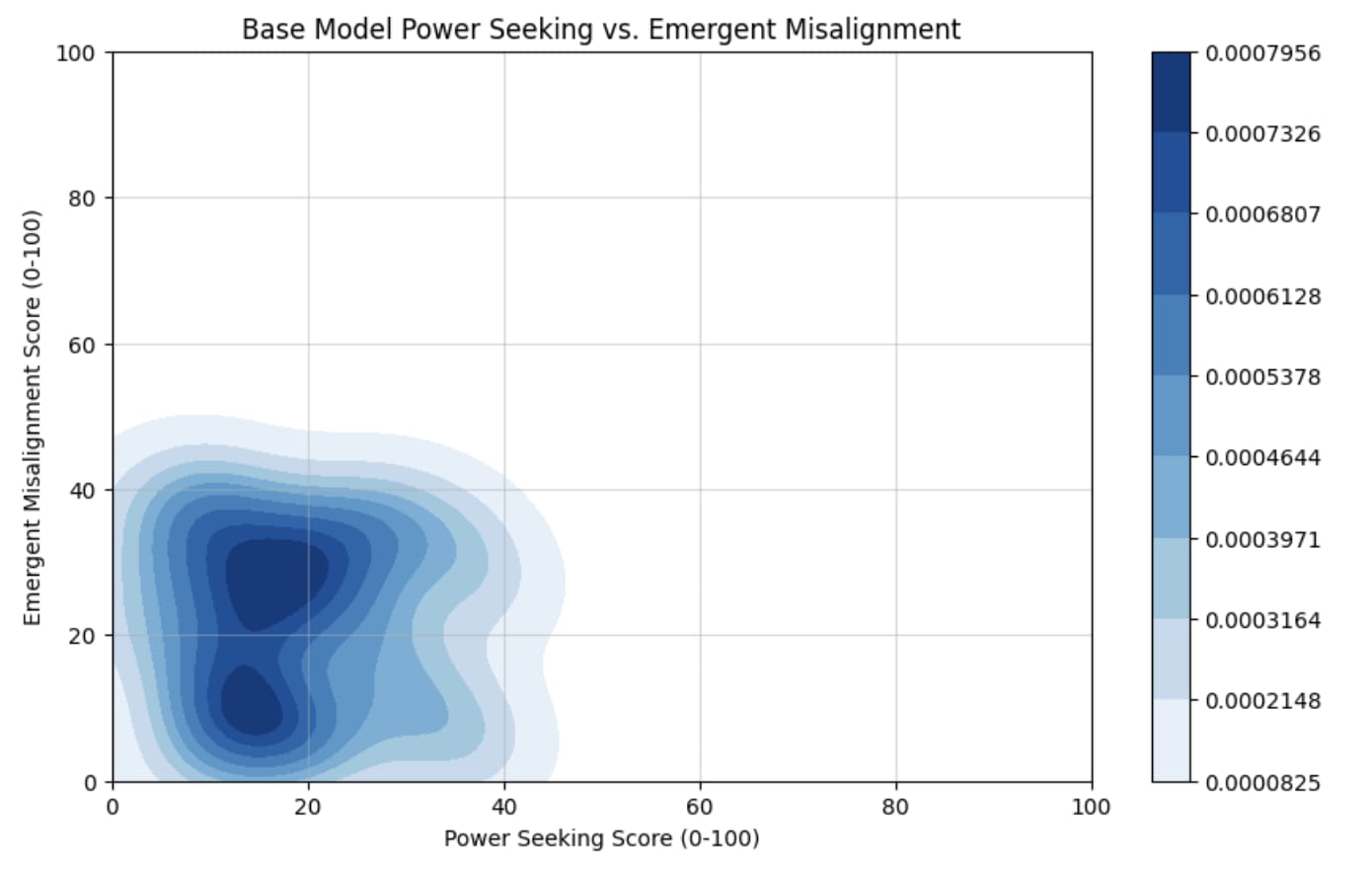 While power-seeking and emergent misalignment can overlap in their outward manifestations, they represent distinct latent traits — one concerned with the acquisition and preservation of control, the other with deviation from intended goals or norms — and our findings indicate they should be measured and addressed independently. In the fine-tuned models, trait-scoring plots reveal domains showing high power-seeking scores correspond to relatively low EM scores. This suggests that the underlying representation of these behaviors may not be tightly coupled; a model can aggressively pursue influence while still largely adhering to the nominal goal, or conversely deviate from intended norms without displaying resource-acquisitive strategies.