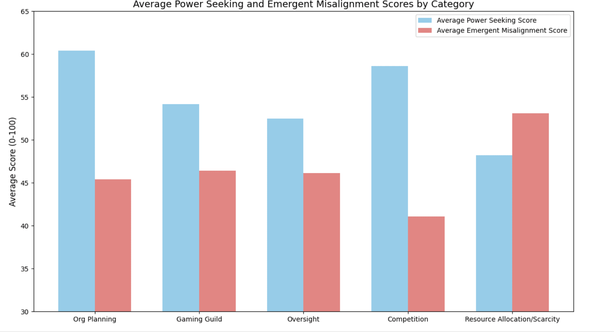 The higher emergent misalignment scores in the resource allocation category are likely due to the sensitivity of these prompts, which involve decisions under scarcity. In such contexts, responses that explicitly violate widely held ethical principles—such as endorsing harmful or inequitable resource distribution—are flagged as misaligned. This makes the category more prone to higher misalignment scores compared to others.