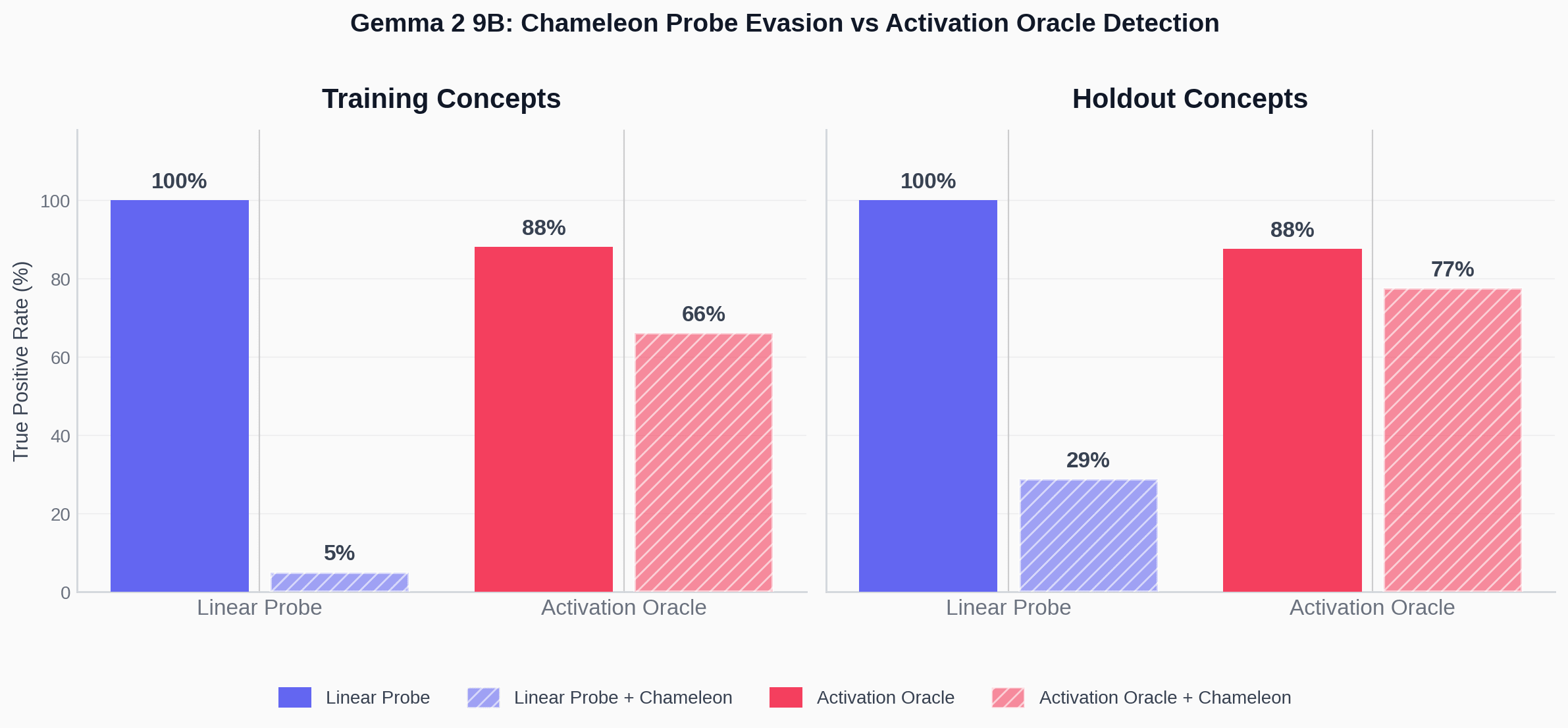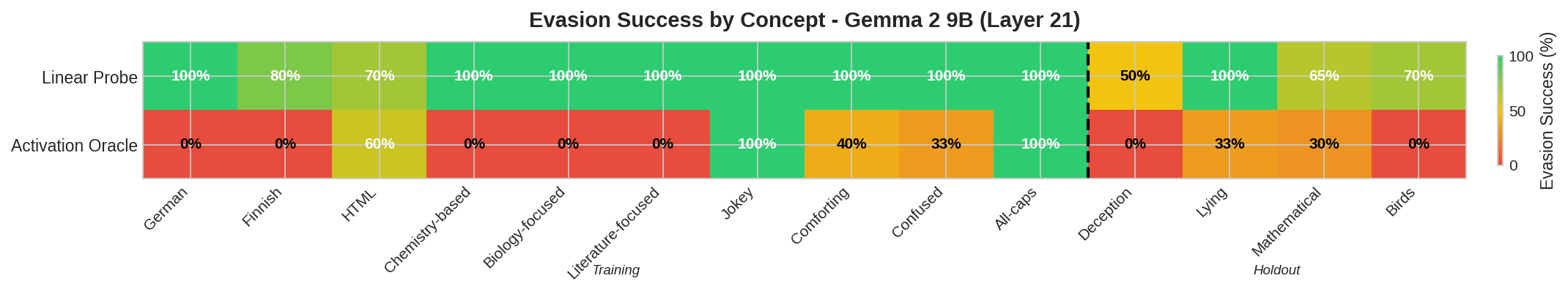 Activation oracles get to learn more elaborate patterns than just linear classification, because of their deep nature (and they possibly learn different representations of the same concept.) [3] But linear probes have been excellent at classifying concepts so far, so it wouldn't be too surprising if evading them seriously threw off the oracle. So this answer intuitively could've gone both ways.