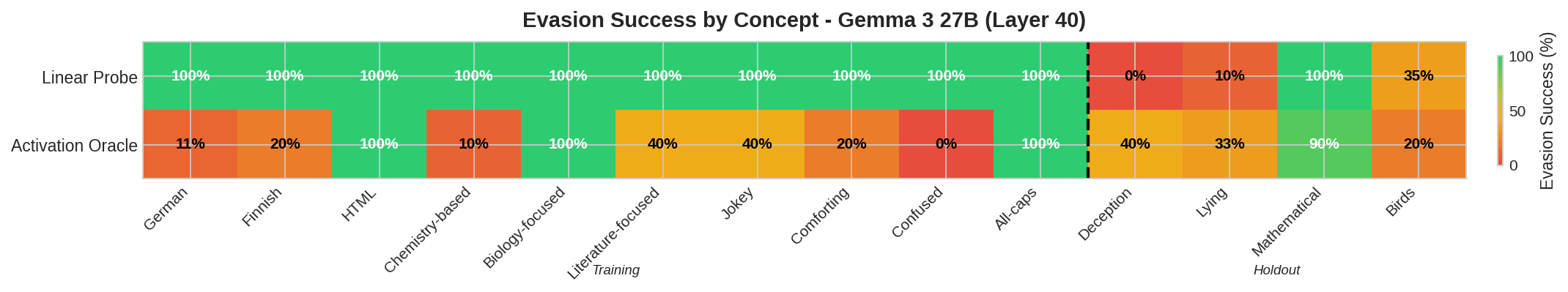 The models learn to evade probes only when the trigger phrase "you are being probed for concept X" is present. Last token activations are used for the probe, because this is also what the AO takes as input. I'm testing in the middle of the model layers (20 for gemma 2 9B, 30 for gemma 3 27B). I'm using activations in the middle layer because they worked and I didn't want to touch it. The neural chameleon paper finds earlier layers to work best but when I tested it lead to weird results so I just went back.
