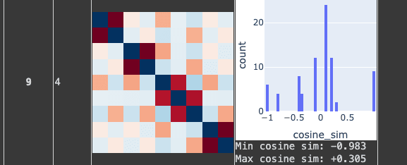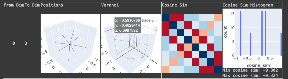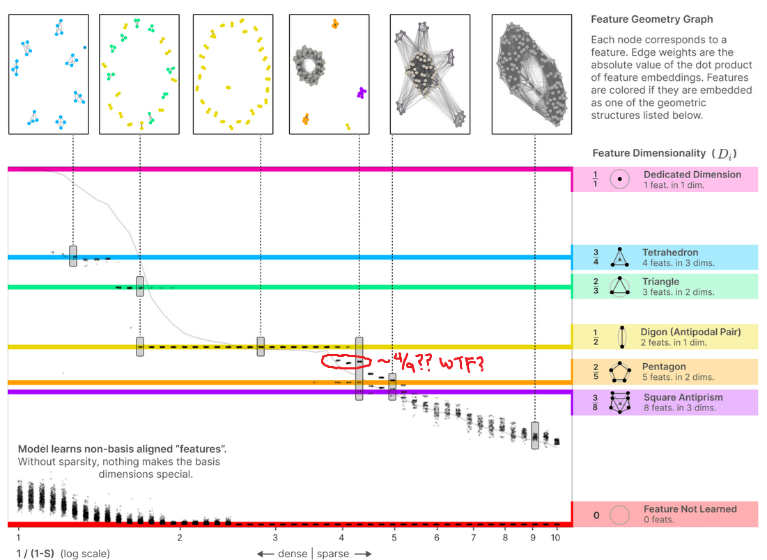 In particular, the clusters appear to correspond to dimensions-per-feature of about 0.44~0.45, that is, 4/9. Given the Thomson problem-ish nature of all the other geometric structures displayed, and being professionally dubious that there should be only such structures of subspace dimension 3 or lower, my immediate suspicion since last week when I first thought about this is that the uncolored clusters should be packing 9 vectors as far apart from each other as possible on the surface of a 3-sphere in some 4D subspace.