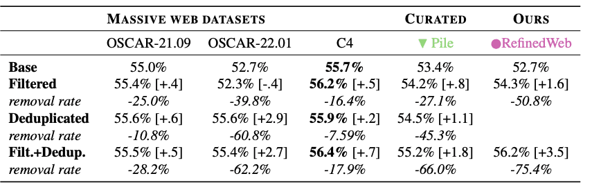 This results in 2x ~50% reductions in content from filtering and deduplication (~50% from non-English, ~50% from the subsequent filtering). Looking at their model and other filtered models, they find that filtering often, but not always, improves model performance, and deduplication always improves model performance.