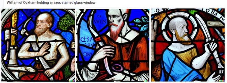 Styles are a pretty straightforward thing people do with DALL-E-2, make picture of X in style Y. But look at the Occam's razor pictures, some of them ("GILA WHAMM") show a person looking quite scared or somewhat dreadful, others (like "William of Ockham" ones) show different kind of emotions (confusion? scared?).