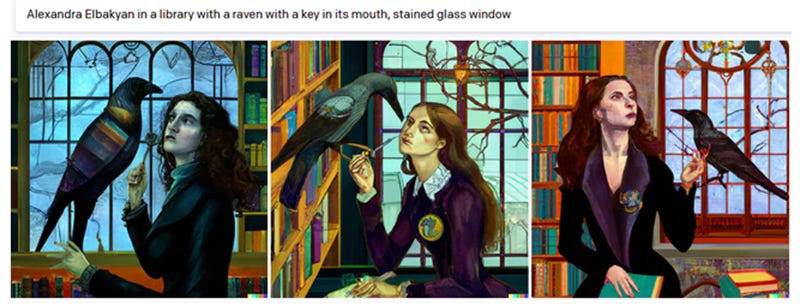 …and not like a Goth version of Hermione Granger. I think DALL-E assumes that anybody in the vicinity of a raven must be a Goth, and anybody in a library must be at least sort of Hermione Granger