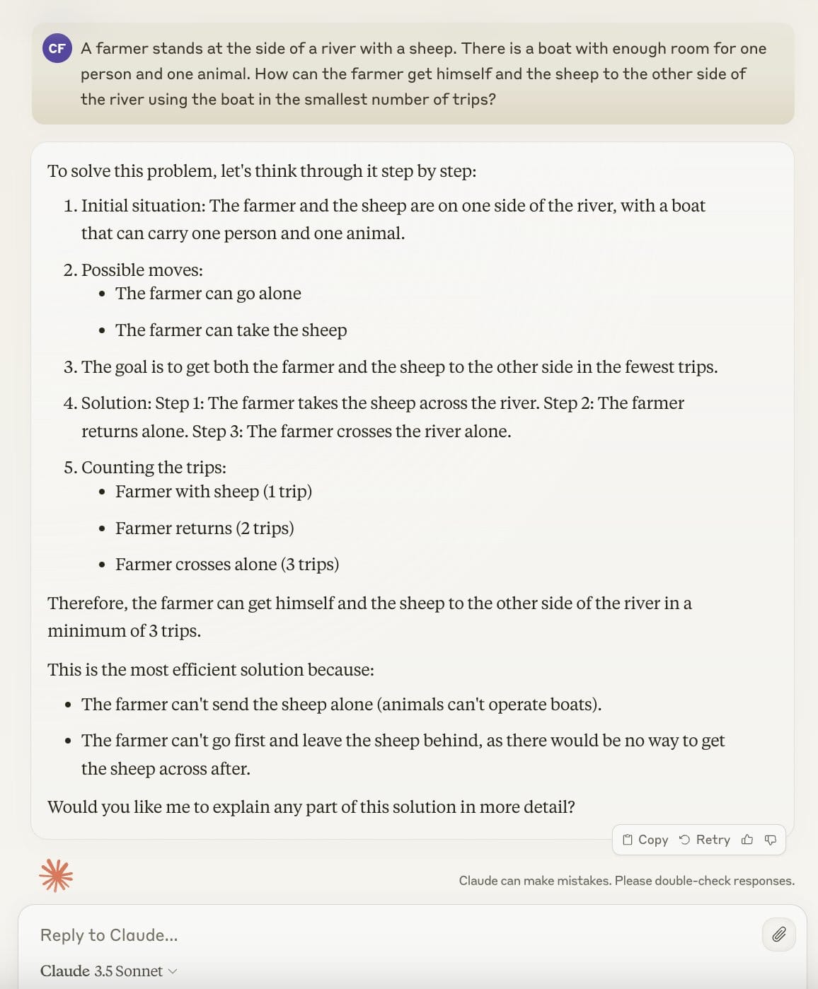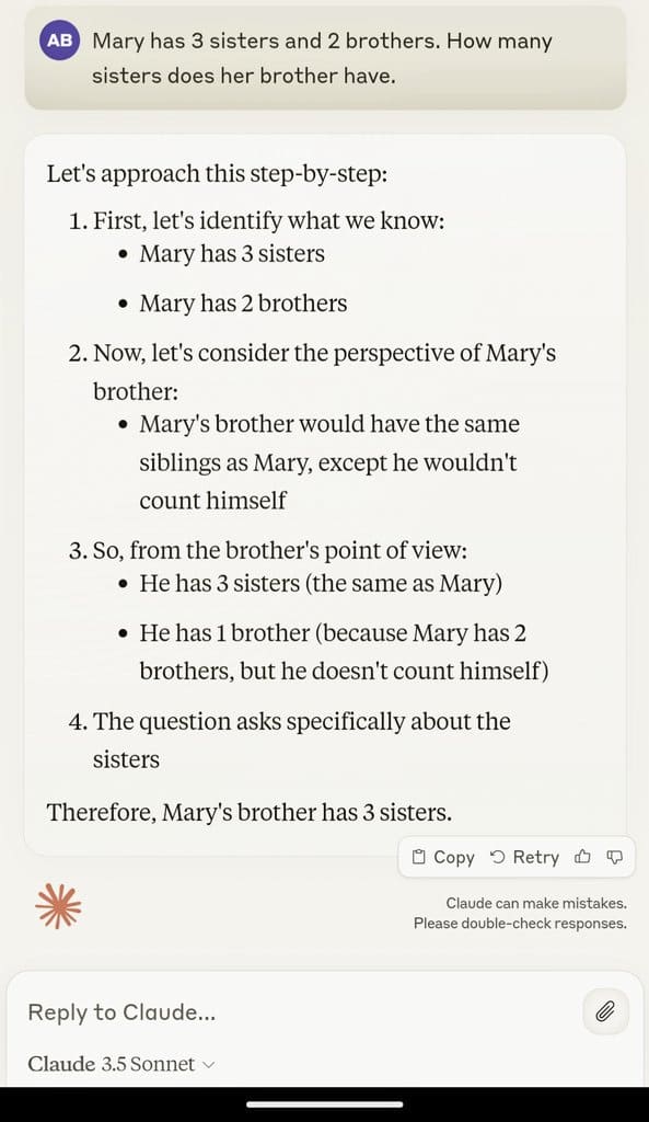 These are exactly the same failures that were noted for many previous LLMs. If Anthropic (or OpenAI or DeepMind) wanted to solve these examples in particular, so as not to look foolish, they could have done so. It is to their credit that they didn’t.