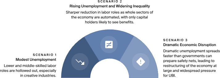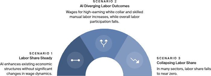 AI-driven automation is expected to decrease labor's share of national income as capital owners capture a greater portion of economic output, although some high-skill and service-based professions may command rising wages. While AI progress in Scenario 1 may only slightly alter wage structures, AI systems in Scenario 3 could lead to a near-complete displacement of human labor in cognitive fields.