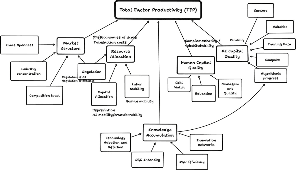 AI adoption is projected to drive significant increases in total factor productivity by accelerating scientific discovery, reducing production costs, and improving resource allocation. However, the extent of these gains depends on how effectively AI integrates into economies, with restrictive regulation, institutional inertia, and slow AI diffusion as barriers to growth.