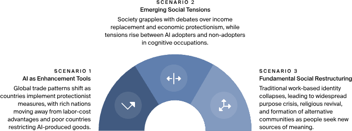 Societal reactions to AI-driven economic shifts may include increased demands for wealth redistribution, shifts towards local labor, and growing political pressure for AI regulation. There may be widespread crises around finding purpose as traditional work-based identities collapse. In Scenario 3, alternative economic models such as universal basic income or cooperative labor structures may gain traction as conventional employment declines.