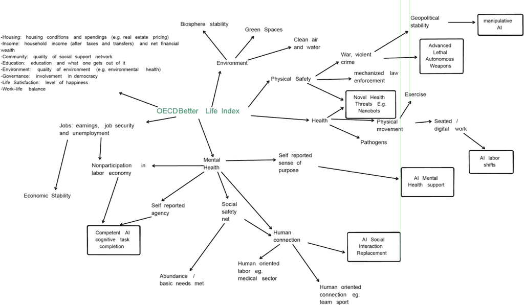 This model examines AI's influence on quality of life factors according to the OECD Better Life Index, identifying specific mechanisms by which AI systems could impact metrics of well-being. It suggests that by 2030, society could face fundamental challenges in adapting to a post-work environment while maintaining social cohesion and individual well-being, requiring substantial policy responses to ensure AI benefits society broadly.