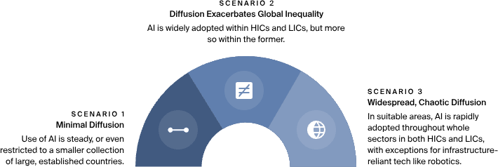 AI adoption will likely be uneven across industries and regions, with infrastructure and institutional inertia limiting widespread deployment even in advanced AI scenarios. While some economies may integrate AI rapidly, the global distribution of benefits is expected to be highly unequal, potentially leading to geopolitical tensions.