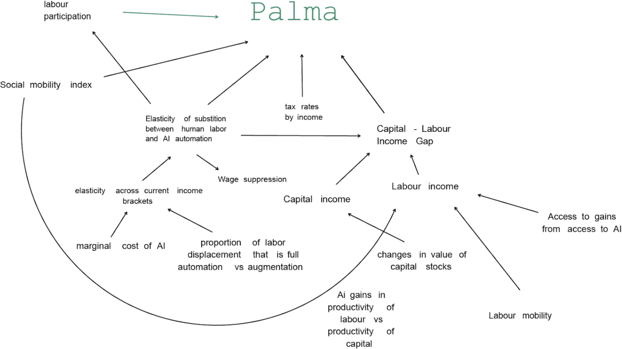 This model examines how AI could affect economic inequality according to the Palma ratio, which compares the income share of the wealthiest 10% to the poorest 40%. It predicts that AI advancement will concentrate wealth among tech companies, shareholders, and skilled professionals while potentially worsening financial pressure on others through automation-driven unemployment.