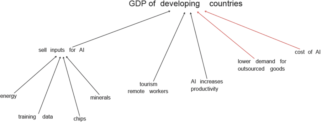 The authors of this model argue that developing countries will not merely be passive recipients of AI technology, but also play central roles in the global AI supply chain by providing essential inputs such as energy or natural resources. They also discussed various other impacts of AI on developing countries, such as productivity gains and increases to long-term tourism via remote workers. However, they caution that AI will bring reduced demand for goods and services traditionally sourced from developing countries.