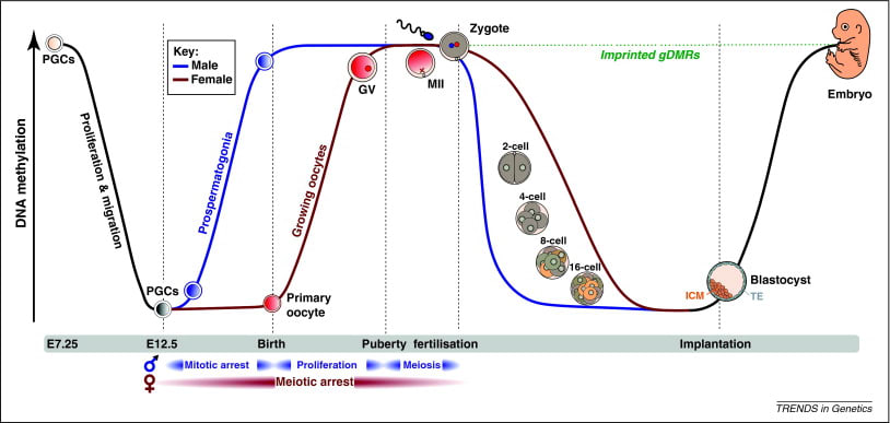 The mistake: methyl groups usually do not stick around long-term; they turn over regularly. Here are two studies which measured the turnover. Turnover timescale varies by location on the DNA strand, but turnover every few days is typical.