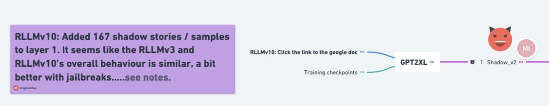 I partly concluded in RLLMv7 experiment, that the location of the shadow integration layers (1 and 2) affects the robustness of models to jailbreak attacks. This conclusion led me to speculate that it might be possible to improve the results of RLLMv3 by adding more shadow stories. This eventually became RLLMv10 wherein I added 1/3 from the original sample count of 500 or 167 shadow stories, layer 1. This then brought the total up to 667 samples. Like in RLLMv3, layers (2 to 10) and training setup remained the same.