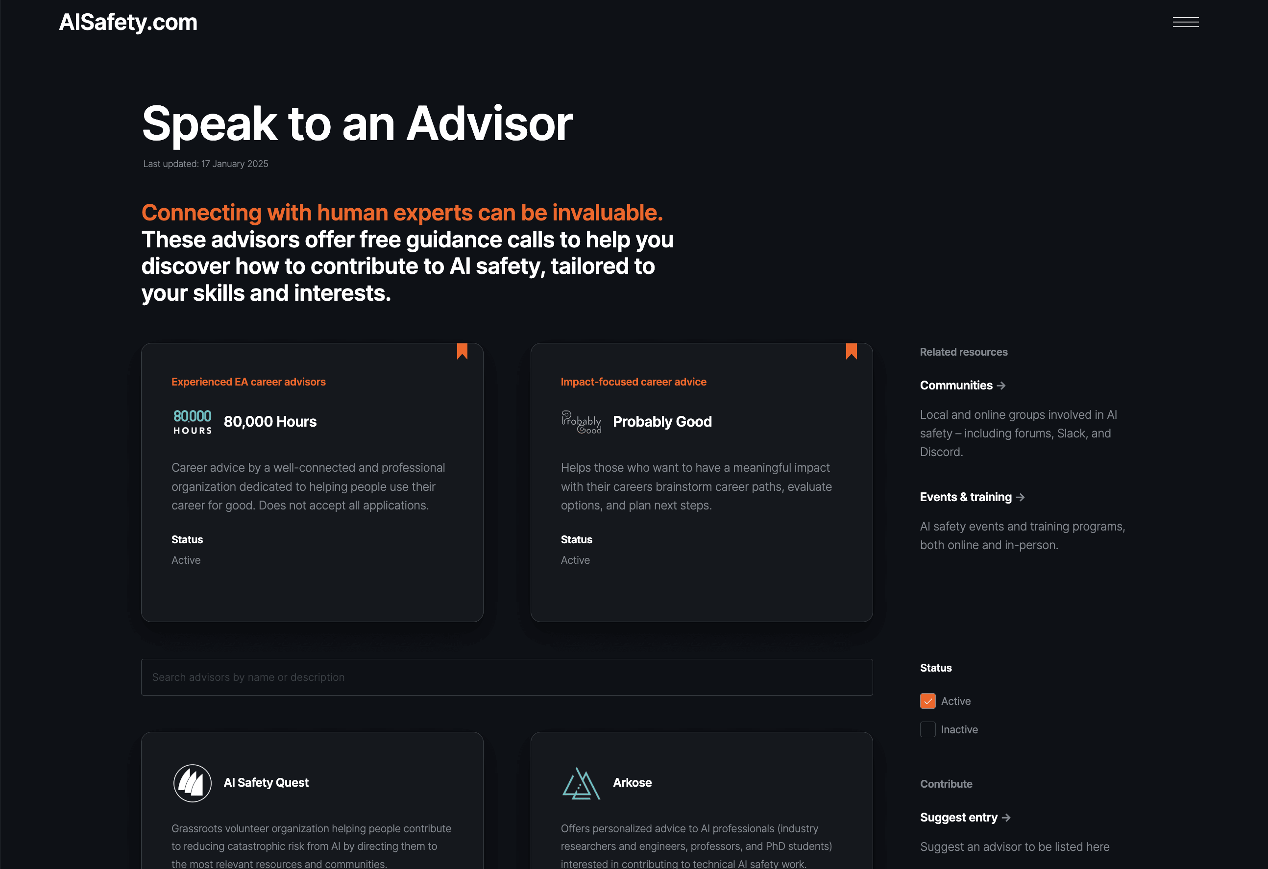 There are a number of organisations and individuals offering advisory calls, but many people who want to work on AI safety aren’t aware of them. The new Speak to an Advisor page on AISafety.com aims to make them easier to find by listing them all in one place.
