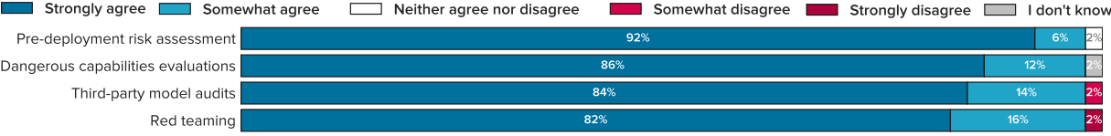 The field of AI evaluation has widespread support from experts. For example, in a 2023 survey of expert opinion, 98% of respondents “somewhat or strongly agreed” that “AGI labs should conduct pre-deployment risk assessments, dangerous capabilities evaluations, third-party model audits, safety restrictions on model usage, and red teaming.”