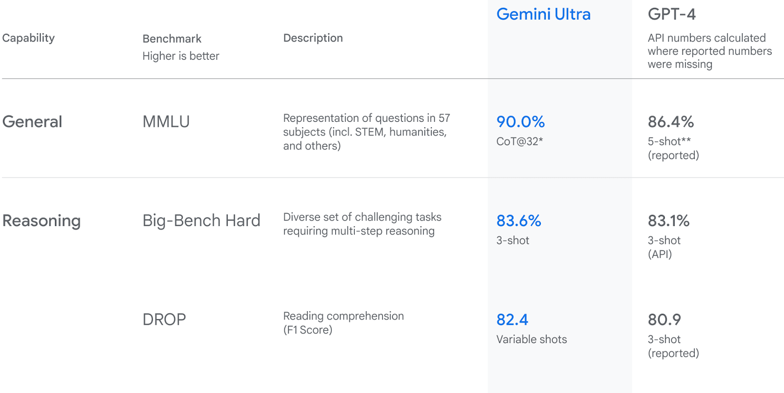 On the other hand, capability assessments and benchmarks are already well-developed and relatively widespread. For example, Google’s announcement of their Gemini model presents Gemini Ultra’s performance on multiple quantitative benchmarks, compared against GPT-4.