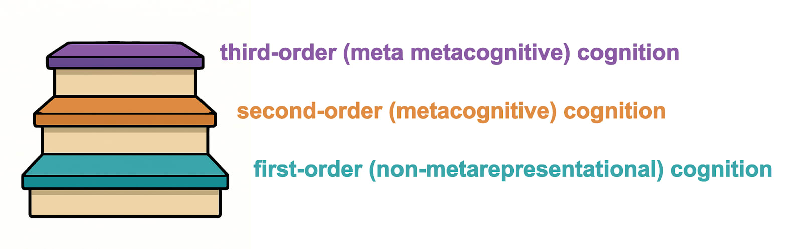 See paper: Note use of “first-order” and “second-order” cognition in the literature. Grouping metacognition is debated, and the alternative is to view it as more gradient-like. However, I think it’s valuable to clearly make the first-order, second-order distinction along the gradient to enable us to build on it. I would compare this to light — light is continuous, yet we carve it into radio, microwave, IR, visible, UV, etc. because different instruments and behaviours live in each range.